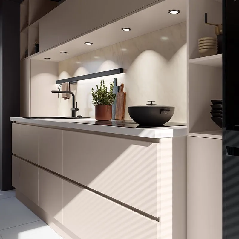 La disposition en I offre une grande fonctionnalité, car tous les éléments de la cuisine sont disposés le long d’un seul mur et permettent un accès facile à tout. Cet agencement maximise l’espace disponible, ce qui est particulièrement important dans les petites cuisines. Un espace restreint accueille tout de même des cuisines haut de gamme au design moderne si les plans sont bien réalisés et si la pose est effectuée correctement.